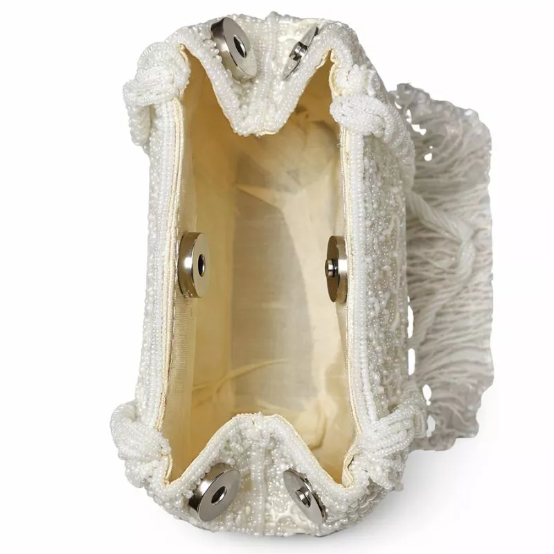Crafted on a premium fabric base and detailed with heavy hand bead embroidery. Accented with fine sequin and cut-bead work, finished with a soft inner lining, a drawstring potli closure, and long beaded fringe detailing for fluid movement.