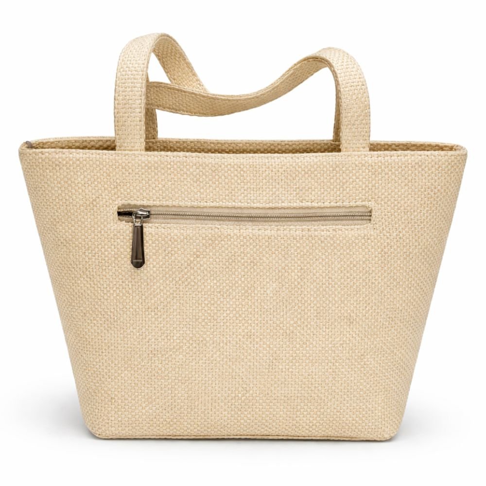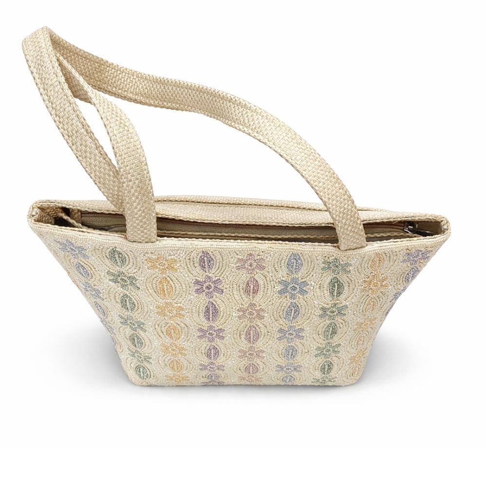Crafted on a premium jute fabric base and detailed with heavy thread embroidery enhanced by delicate bead and sequin handwork. Finished with strong woven handles, a soft inner lining, and an open-top tote construction. Designed with a sturdy structure suitable for both daily use and special occasions.