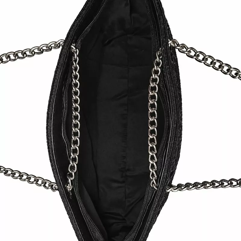 Crafted on a premium fabric base featuring a raised floral embossed texture. Detailed with fine bead and thread work and finished with a soft inner lining. Designed with a secure top zip closure and dual carry options including a short hand strap and a detachable metal chain for shoulder styling.